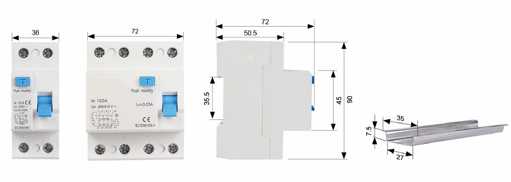 | Номинальный остаточный ток срабатывания (In) | 0,03 А, 0,1 А, 0.3 А |