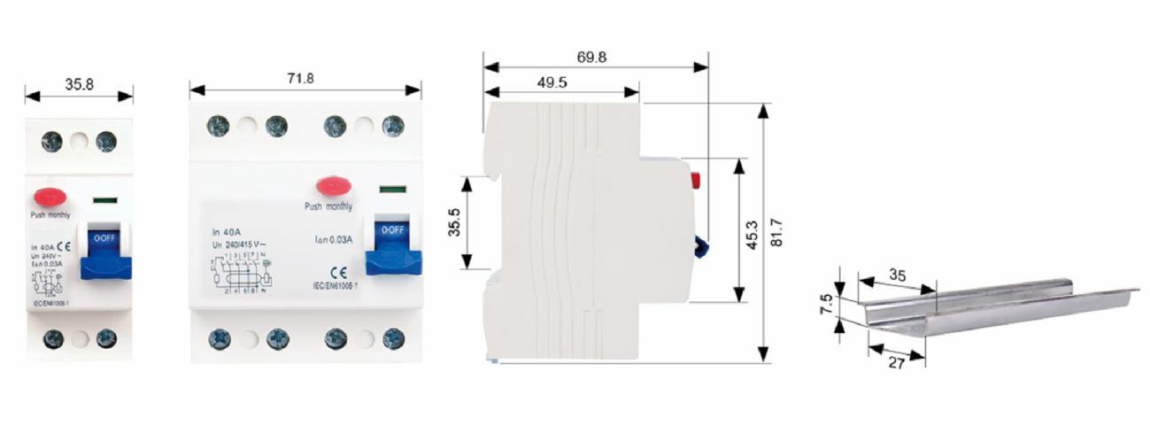 | Номинальный остаточный ток срабатывания (In) | 0,03 А, 0,1 А, 0.3 А |