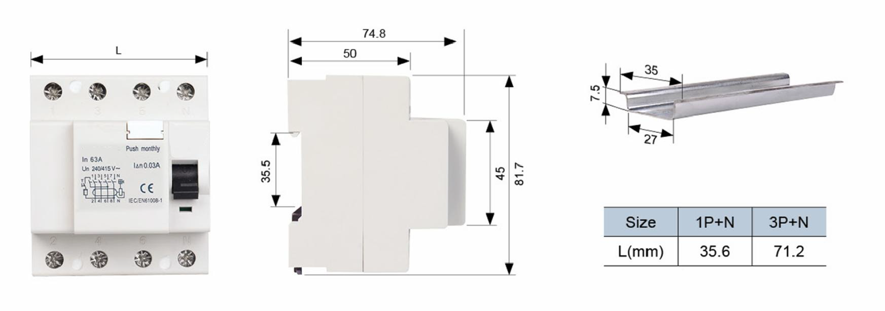 | Номинальные параметры напряжения (Un) | Переменный ток: 240В ~ 1Р+N, 415 V ~ 3Р +N |