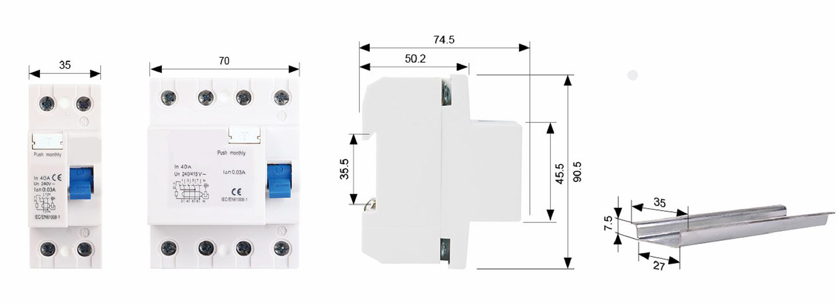 | Номинальный остаточный ток срабатывания (In) | 0,03 А, 0,1 А, 0.3 А |