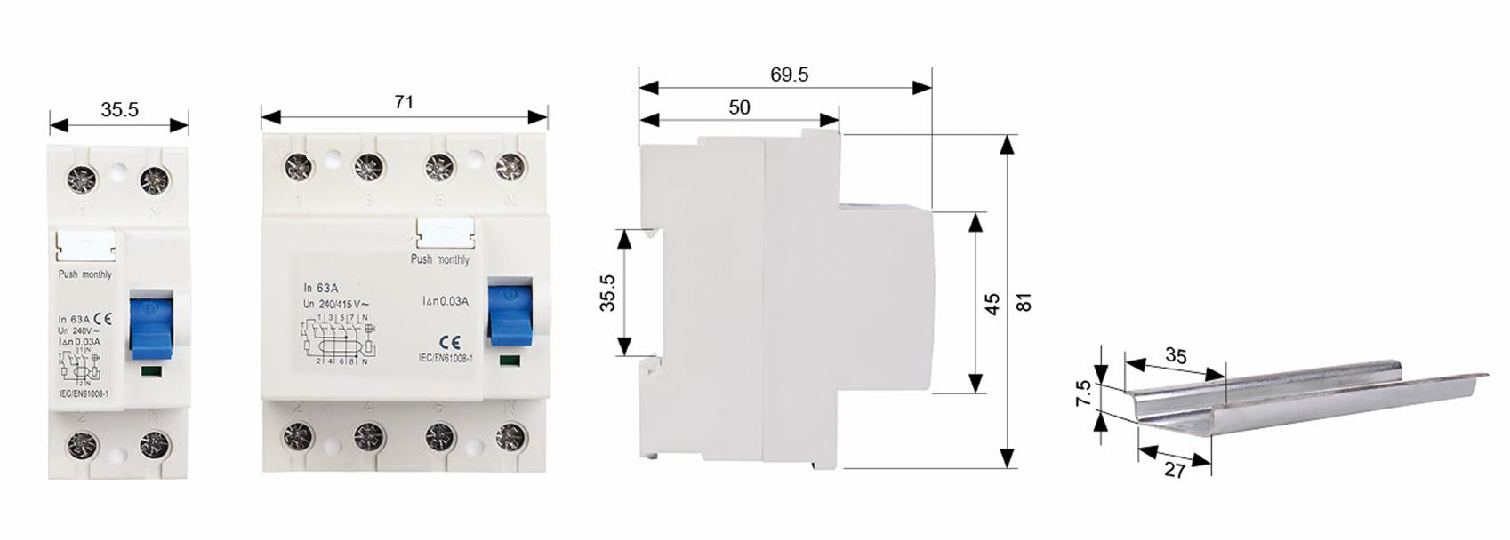 | Номинальный остаточный ток срабатывания (In) | 0,03 А, 0,1 А, 0.3 А |
